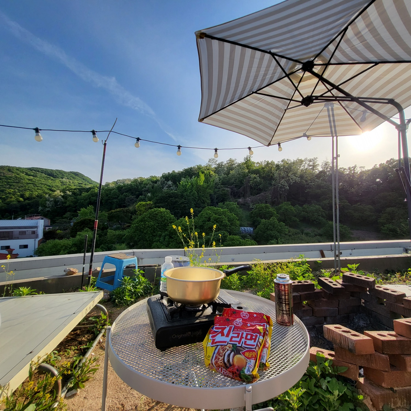 파라솔을 사본적이 없어서 생각해본적이 없는데 저 각도 조절이라는게 3M 짜리에는 있던데 여기는 없다. 그런데 해가 뉘엿뉘엿 질때 각도 조절이 없으니까 이게 해를 그냥 맞는다. 나중에 또 사게 된다면 각도조절이나 높이조절 기능도 있는 걸 좀 고려해봐야겠다. 아니면 천을 하나 덧대서 해 각도가 낮을 때 대비하는 방법을 좀 강구해보든지.