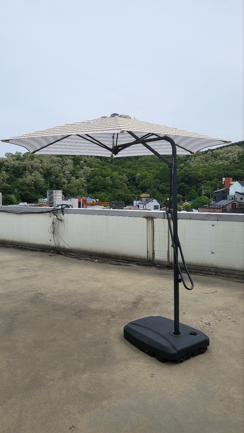 일단 옥상은 먼지도 많고 바람도 많이 불어서 저거 물통형 받침대 큰거 없으면 무조건 날아간다. 날아가서 남의 집 부시거나 가던 차 망가뜨릴까봐 받침대도 같이 구매했는데 매우 만족스럽다. 원터치도 생각보다 잘 만들어서 아 이런게 있구나 하면서 잘 사용하고 있다.