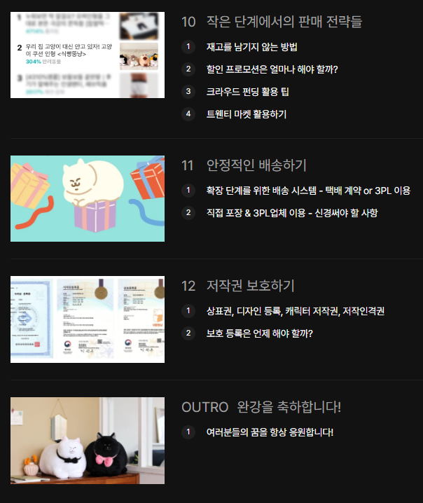 운영, 상품기획, 입점, 판매, 마케팅까지 전반적인 부분에 대해서 다뤄주는 강의였고 저 아기 고양이 이모티콘을 주변에서 자주 쓰는 사람이 있어서 캐릭터가 엄청 가까이 있었달까. 강의를 수강하기 전에 과연 이런 귀여운 캐릭터로 이렇게 이쁜 인형들이 나오면 돈은 얼마나 벌 수 있을까 라는 의문이 들더라.