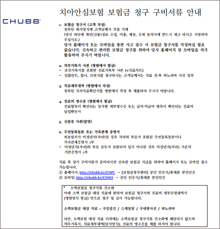 에이스 치아보험(처브치아보험) 보험금 청구서류