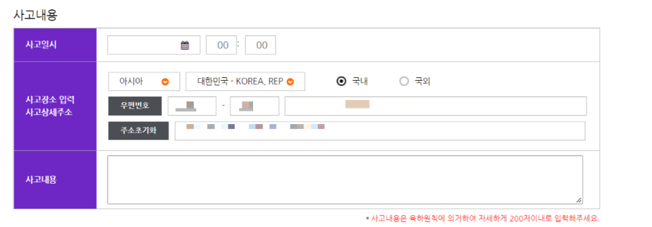 사고장소: 상해로 인한 것이 아니었기 때문에 특정 장소가 없어서 현재(보험 계약상의) 집 주소 입력