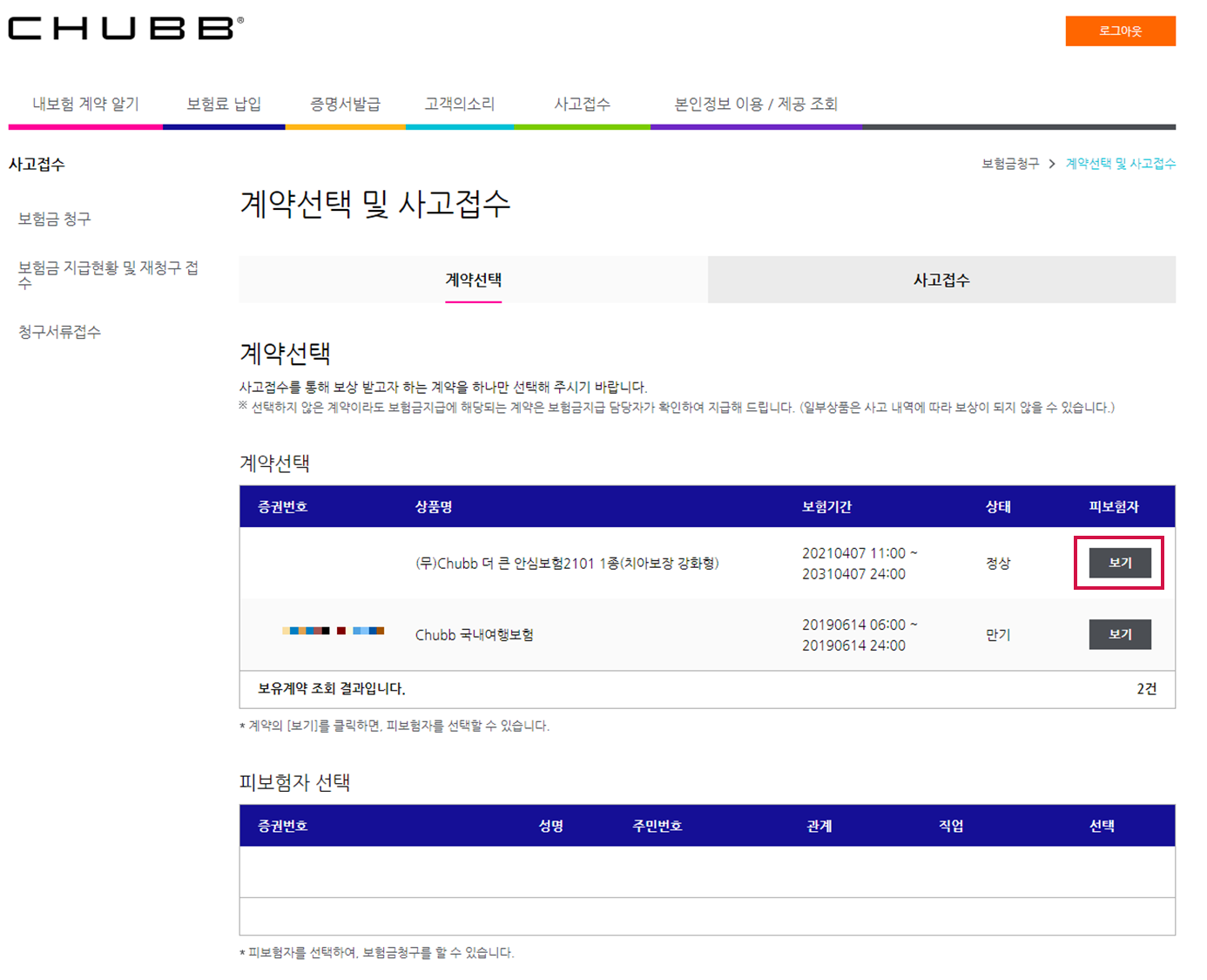 계약선택 항목에서 "보기"를 클릭하기 전에는 아래의 피보험자 선택란이 공백이며, 청구하고자 하는 보험 오른쪽에 "보기"를 클릭하면 아래 사진과 같이 정보가 뜬다.