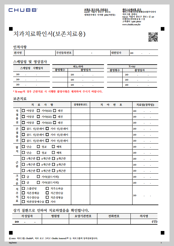 치과치료 확인서는 아래와 같으며, 보존치료용과 보철치료용이 따로 나누어져 있으니 어떤 치료를 받았는지에 따라 해당 서류를 준비하면 된다. 치료 받은 치과에서 해당 양식을 보유하고 있지 않아 직접 준비를 해야 할 경우, 아래의 첨부 파일을 다운 받아 사용하면 된다.