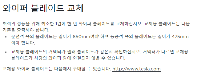테슬라 모델 가이드에서 워셔액을 보충하는 방법과 와이퍼를 교환하는 방법에 대해 자세히 설명하고 있으니 참고할 것. 와이퍼는 테슬라 전용 와이퍼가 있지만 워셔액을 그냥 일반 워셔액을 사용하면 되는 것 같다.