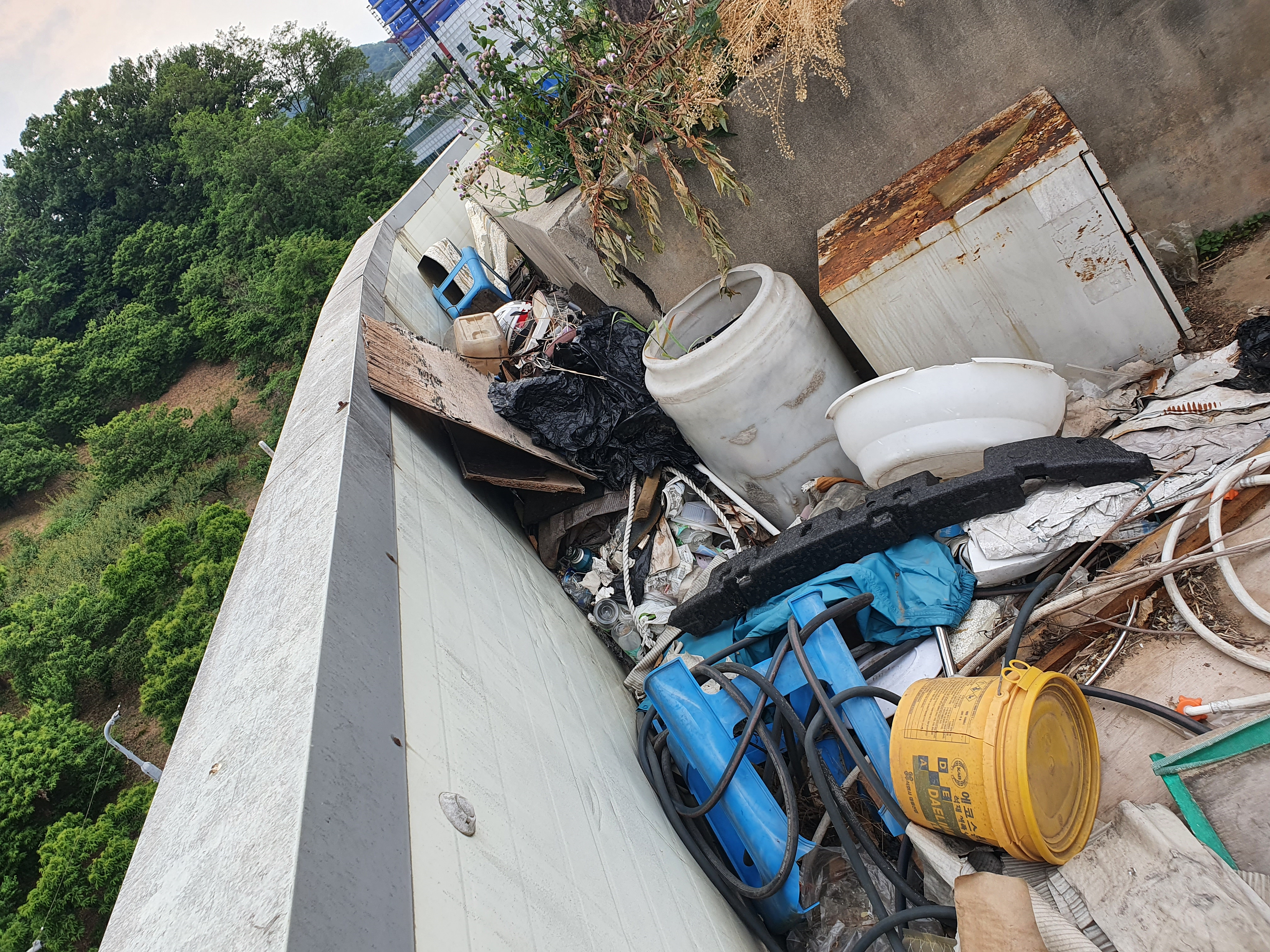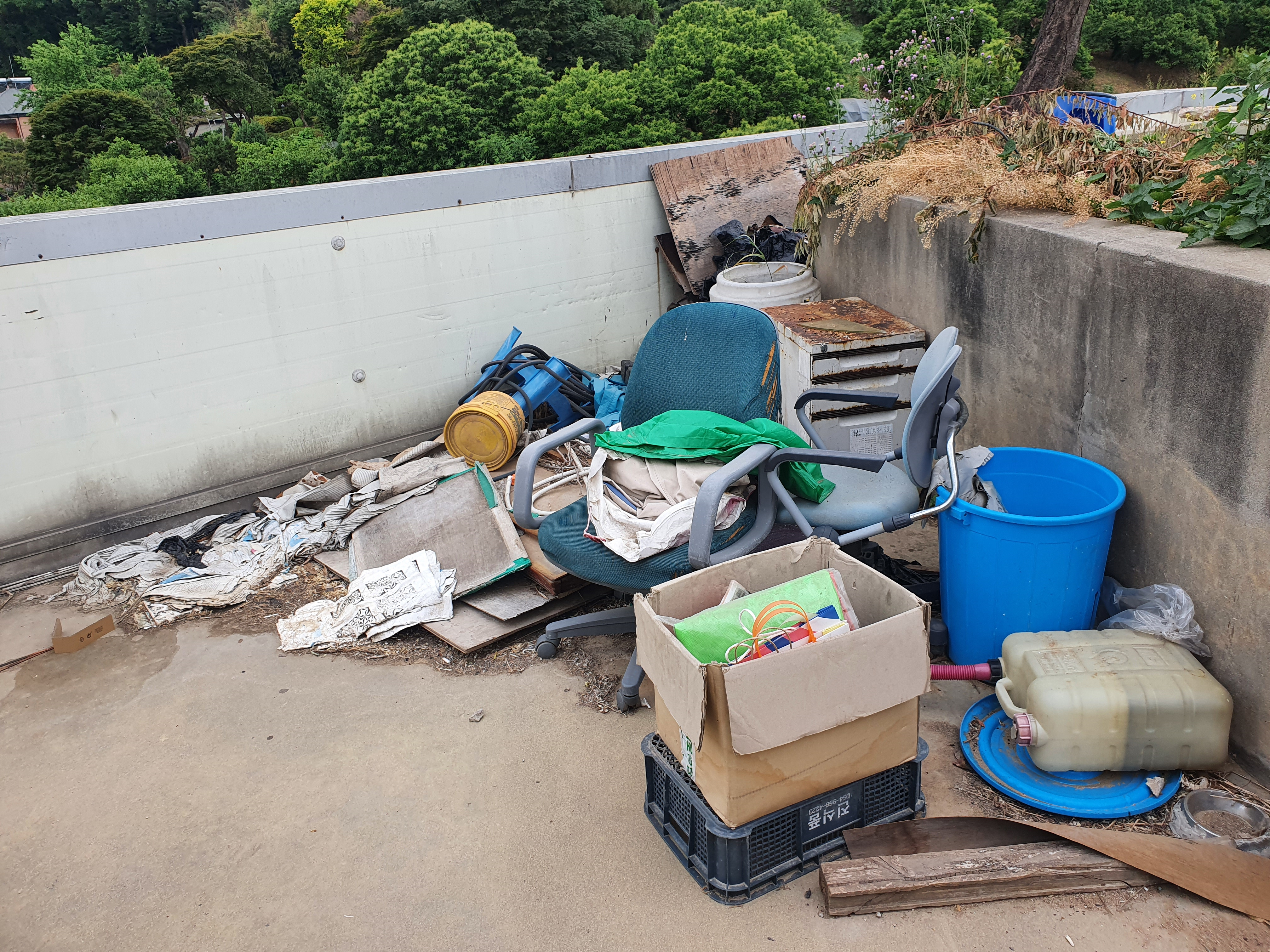 몇 년 동안 임대 사업장으로 쓰였던 옥상 정리를 하려고 보니 위의 사진과 같이 처리 해야 할 양이 정말 산더미라 도저히 엄두가 안났다. 세탁기, 의자, 신발, 캐비넷, 수납장, 페트 부터 정체를 알 수 없는 나무 판자와 그 외 쓰레기들까지.