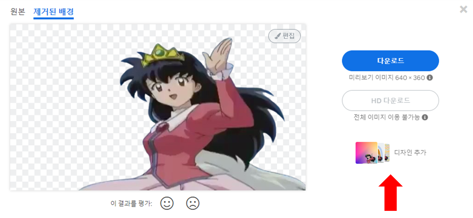 아주 깔끔하게 제거 되었다. 정말 놀랍지 않나? 포토샵이 없어도, 포토샵을 전혀 다룰 줄 몰라도 단 몇 초 만에 배경 제거를 했다. 추가로 정말 놀라운 장점이 있는데 위 사진에 화살표로 표시한 "디자인 추가"를 통하여 여러 배경 합성을 바로 할 수 있다는 점이다.