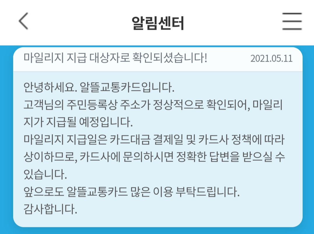 나의 경우 우리체크카드로 사용중인데, 온라인 발급 신청을 하고 수령까지 3 ~ 4일 정도 걸렸던 것 같다. 요즘에는 보통 온라인으로 카드 발급 신청을 하면 바로 간편결제 어플 같은 곳에 등록하여 사용할 수 있지만, 알뜰교통카드는 꼭 플라스틱 카드를 태그 해야지만 마일리지 적립을 받을 수 있기 때문에 카드 수령을 하고 어플에 등록을 해주어야 한다.