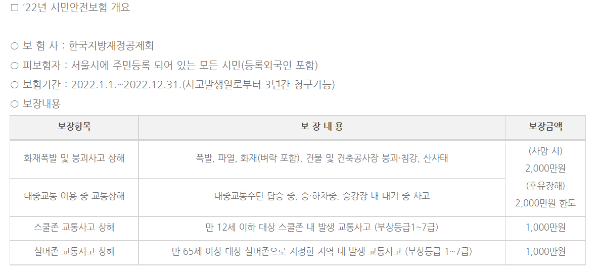 보장 항목 및 내용은 지자체별로 조금씩 다르며 위에 링크를 걸어둔 '국민재난안전포털'을 클릭하면 각 지자체별 내용을 확인 할 수 있다. 위의 사진은 서울시의 보장내용을 가져온 것으로 화재폭발 및 붕괴사고 상해, 대중교통 이용 중 교통상해, 스쿨존 교통사고 상해, 실버존 교통사고 상해 등 4가지 항목에 대해 보장한다.